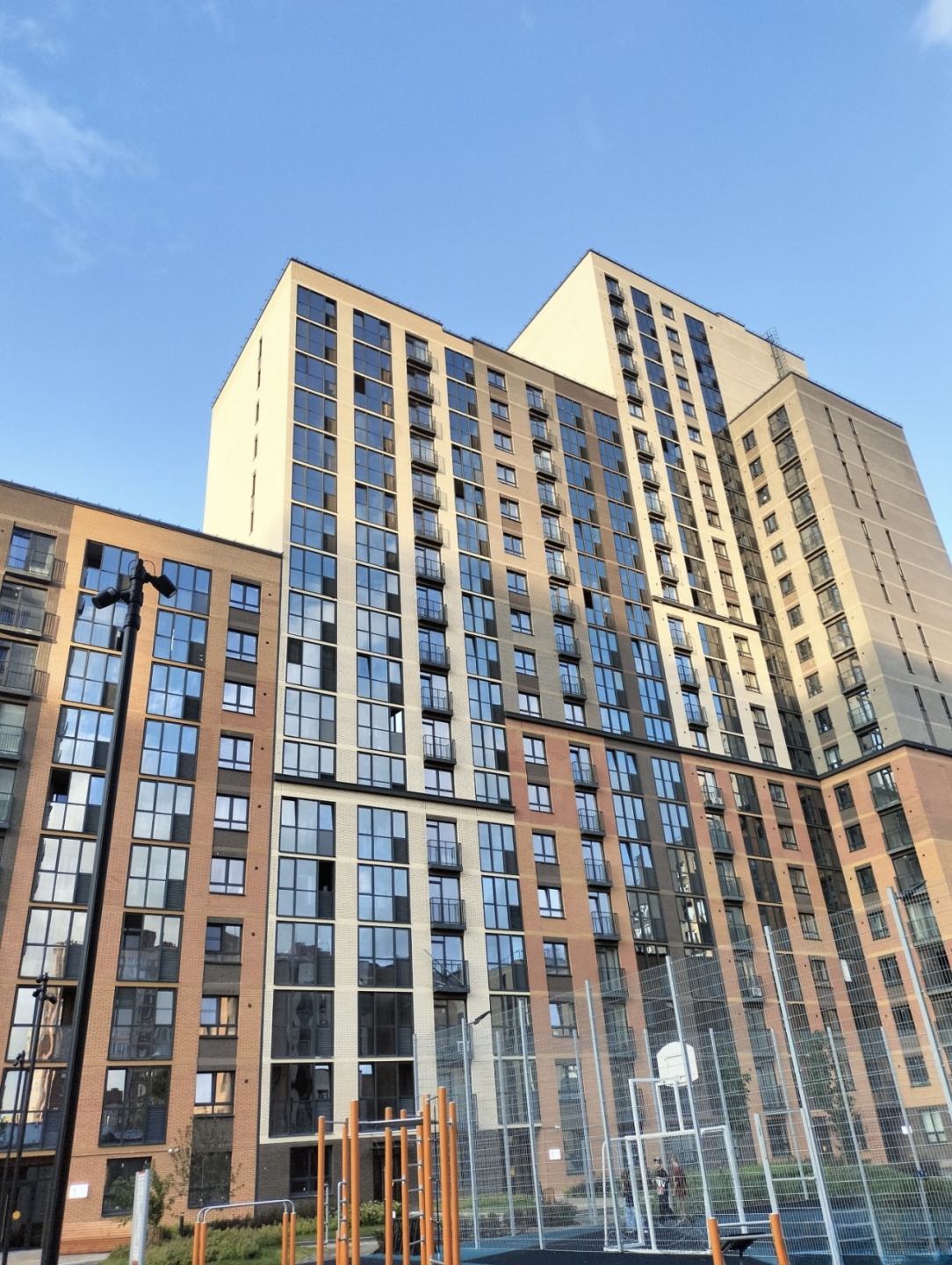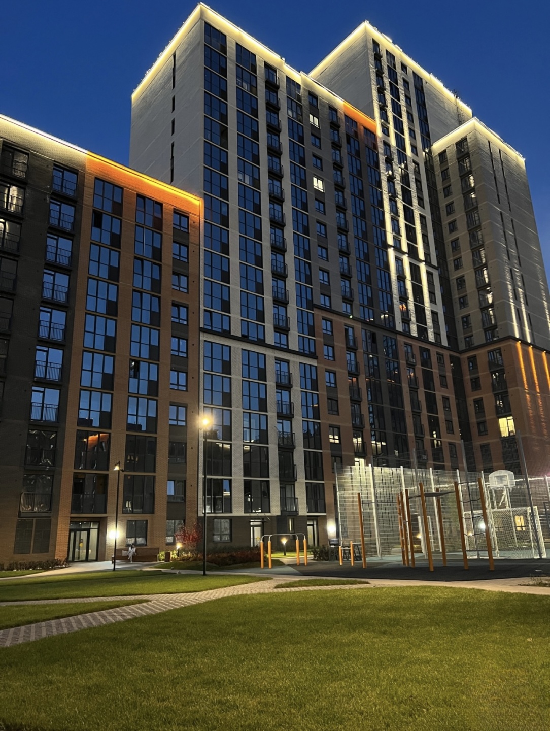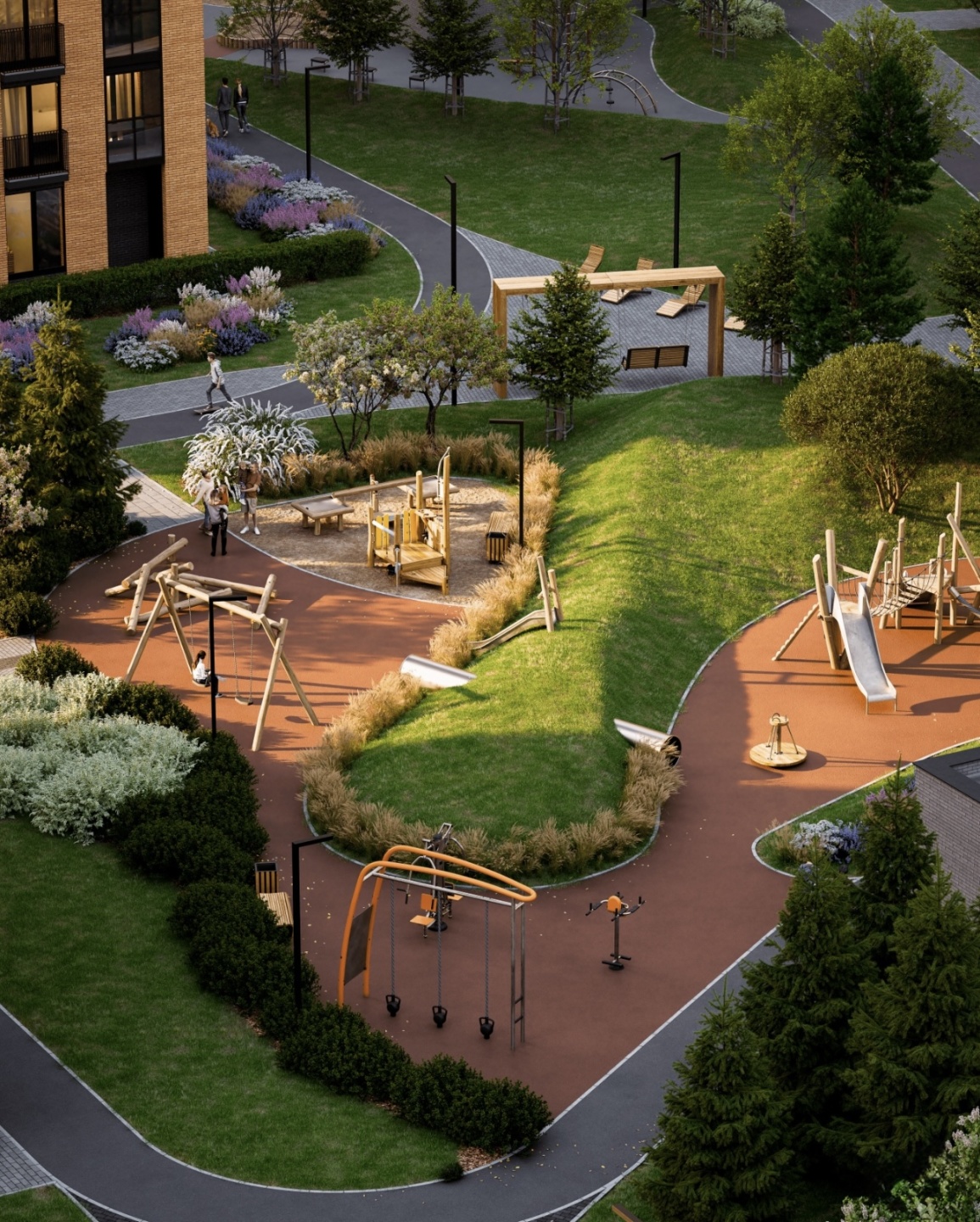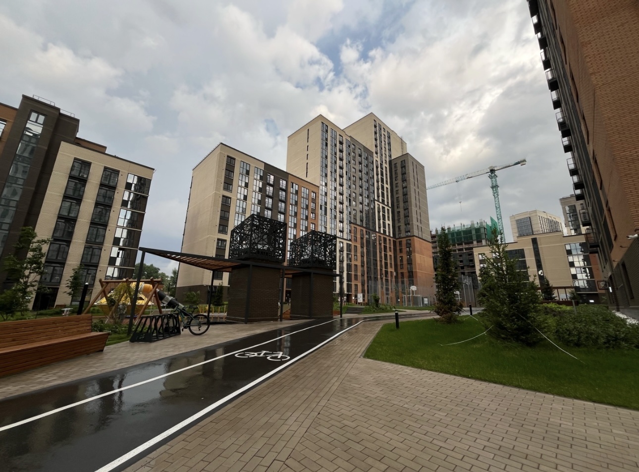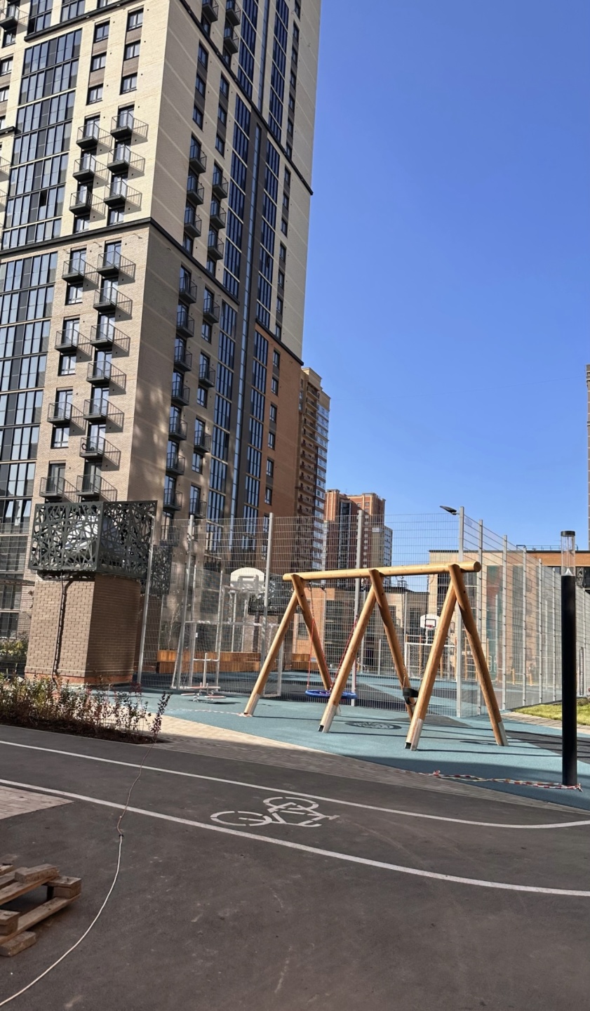 Придомовое пространство комплекса — это благоустроенный тихий двор без машин. Территория огорожена, обустроена детскими и спортивными площадками, а также зонами для отдыха.